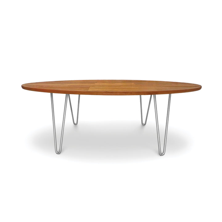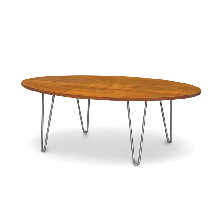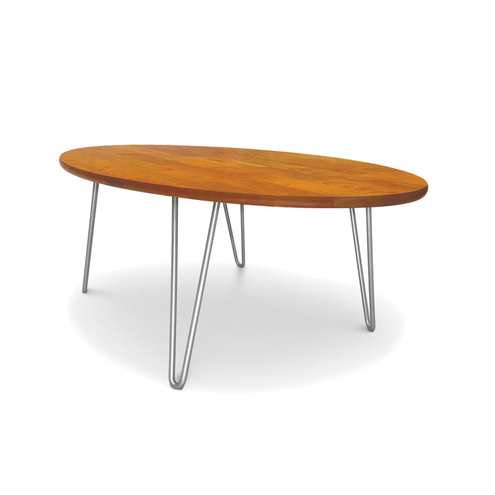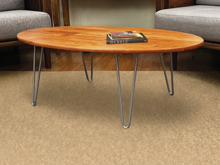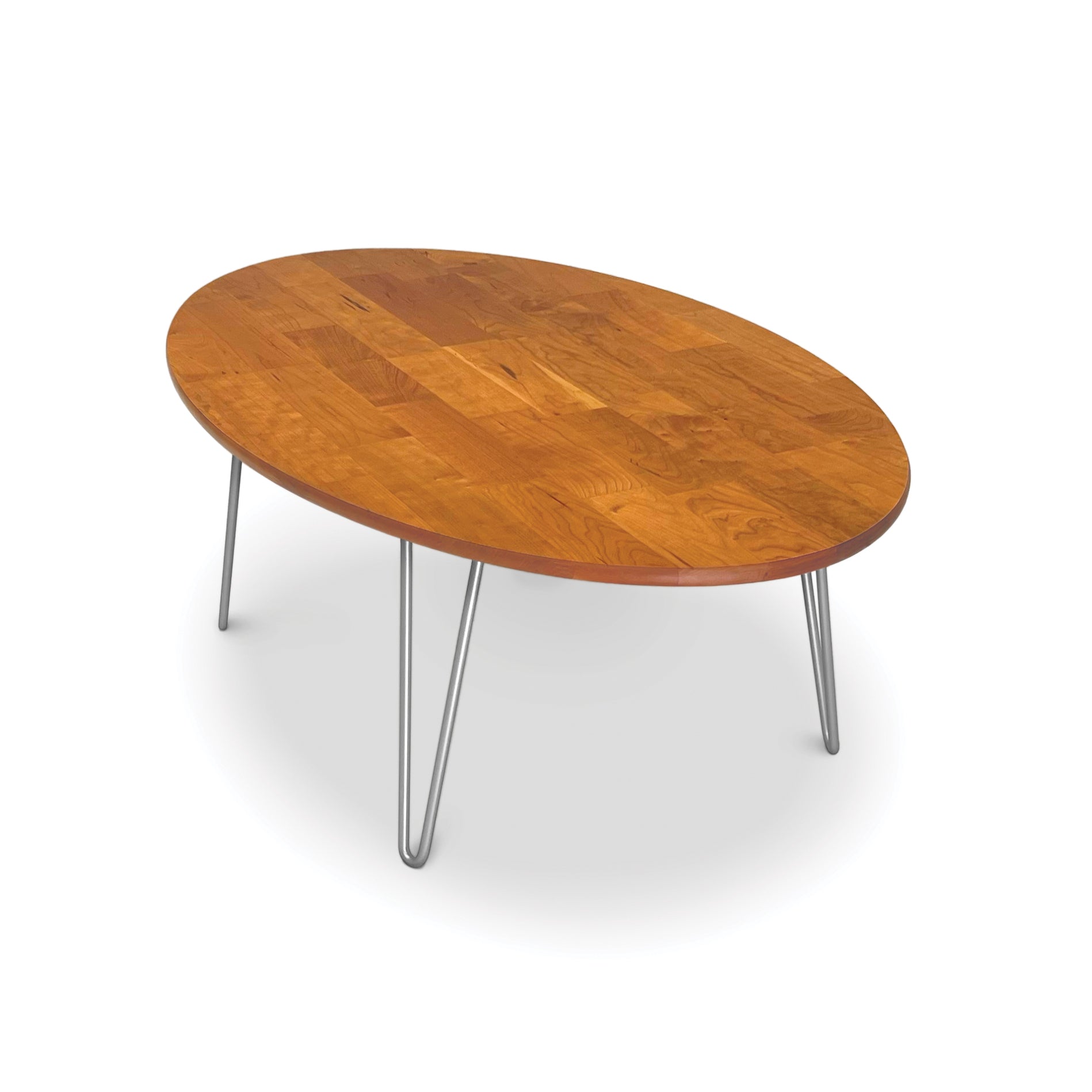 The stylish Sage Oval Coffee Table is crafted in the USA from upcycled North American Cherry hardwood, reclaimed from New England workshops and finished in a durable GREENGUARD Certified lacquer assuring low indoor emissions. Hairpin Legs are steel in a brushed nickel finish.